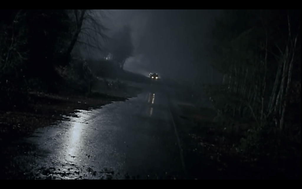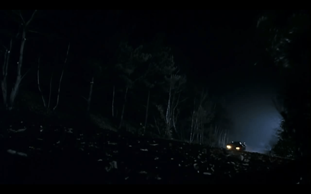 Batman accellera e Burton apre a un supersonico Dutch angle, in cui la foresta, ferita in mezzo dalla strada bagnata (e, fateci caso, nei film la strada è bagnata il 98% delle volte: è un effetto che piace ai direttori della fotografia, e che qui innesca anche un fin troppo facile archetipo inconscio, di quelli che piacciono a me e che piacevano anche a Rachmaninov: non è forse acqua lo stilema degli archi della Ostrov che Elfman gli “ricicla”?), è molto più spettrale di prima, è diventata incubica, numinosa come la musica: un Dies irae di foresta!