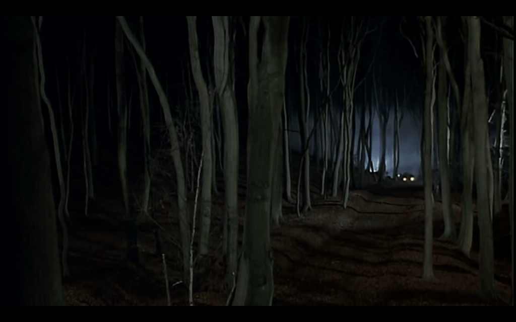 La luce monopuntale è una luce mentale, una luce diffusa che sembra addirittura “amniotica”: una luce che è nascita orrorosa in questo milieu di Dies irae e di foreste scheletrite! Anche perché l’ultima volta che vediamo la luce sembra quasi in fondo a un tunnel perfino uterino, seppur boscoso (naturalmente in Dutch angle)!