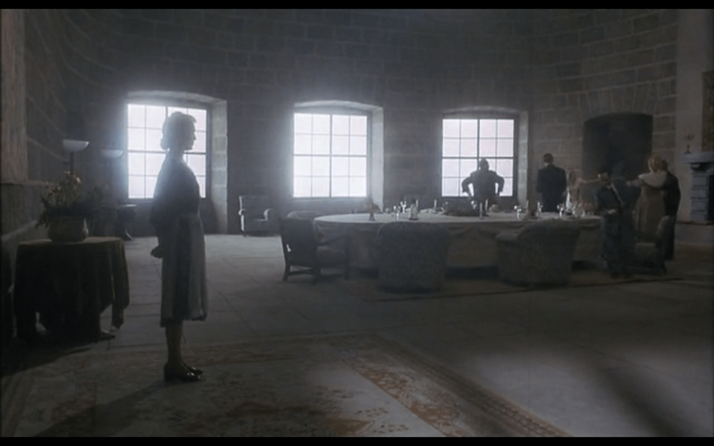 Il porticato di Berghof, che vediamo molte volte, è zeppo di colonne sghembe, che dànno a tutto un tono di stranezza… “Sghembezze” che sono anche nelle stanze di Berghof, piene di linee “diagonali” che turbano l’impianto più possibile simmetrico delle inquadrature…