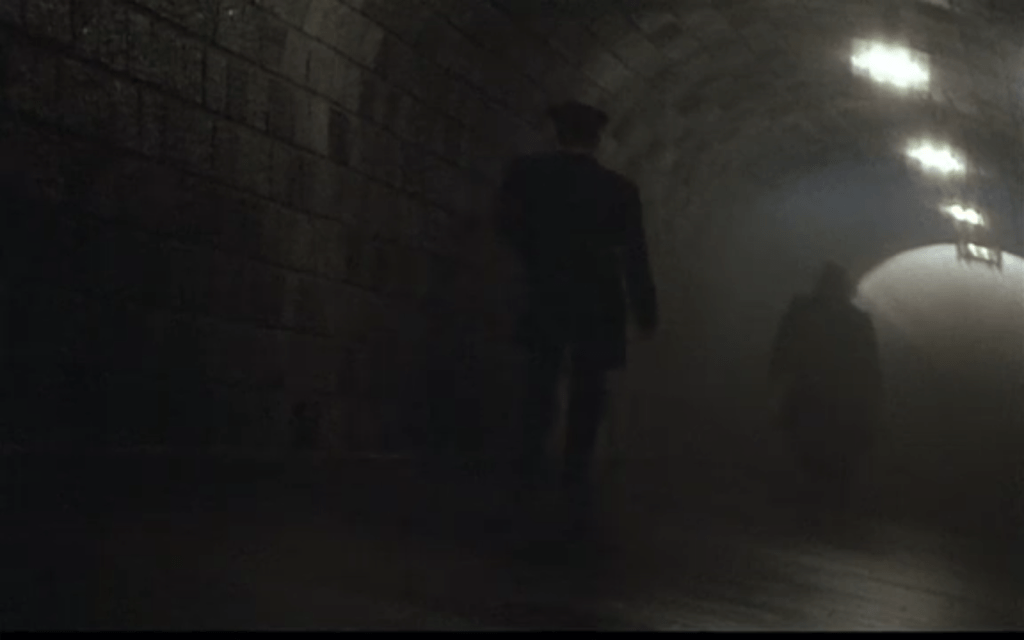 Mentre tutti escono di scena dal fondo dell’inquadratura, Bormann, invece, “esce” dirigendosi violentemente verso la macchina da presa, finendo proprio per “sbatterci contro”: è il nero causato da Bormann davanti all’obiettivo che costituisce lo stacco verso l’inquadratura successiva…