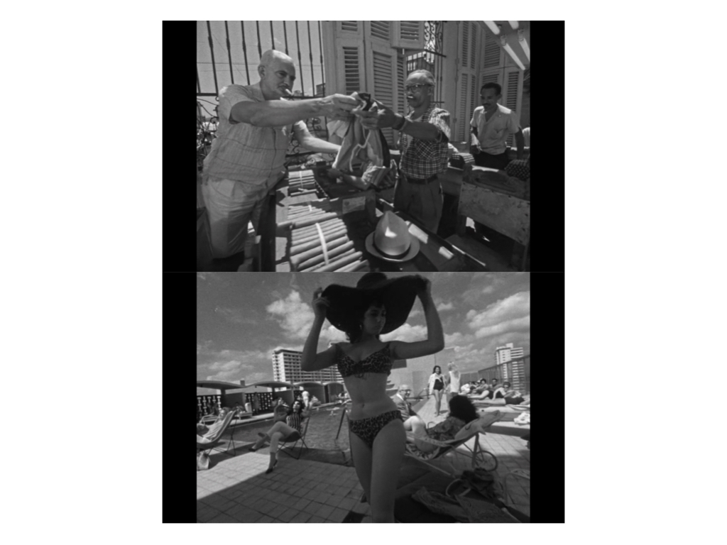 In 140 minuti quasi esatti, Kalatózov opta per una narrazione che non è una vera narrazione ma una presentazione lievemente diegetica, priva di qualsiasi supporto allo spettatore voluto dalla Hollywood classica e parruccona (ancora attiva, nonostante tutto: oltre al Nutty professor di Lewis e alla Pink panther di Sellers, nel 1963 escono anche il Camelot di Joshua Logan, con la sua parrucconissima gestione del sound stage, e The great escape di John Sturges, denso di star system e di semplificazione della Storia, maiuscola, in storia, minuscola), che inanella paratatticamente quattro micro-storie di vita quotidiana a Cuba durante il regime di Batista quasi su un piano inclinato in salita, dalla più particolare alla più universale, fino all’ultima vicenda di partecipazione collettiva alla lotta di liberazione. Tutte e quattro le storie sono incorniciate dalla voce della stessa Cuba (la voce è di Raquel Revuelta), che si presenta con il titolo, «Soy Cuba» (tutti parlano la loro lingua madre nel film: i cubani parlano spagnolo e gli americani inglese), a commentare le vicende con interventi velatamente poetici, scritti da Evtušénko, che seguì la Revolución come corrispondente della Pravda, e allora non proprio nelle grazie di Chruščëv dopo le noie per la Sinfonia n. 13 di Šostakóvič, basata su un testo di Evtušénko sul massacro di Babij Jar, invisa al partito ed eseguita solo con sapienti sotterfugi da Šostakovič e dal direttore d’orchestra Kiríll Kondrášin nel 1962 (Kalatózov e Urusévskij ebbero grossi problemi a includere il poeta nella crew)…