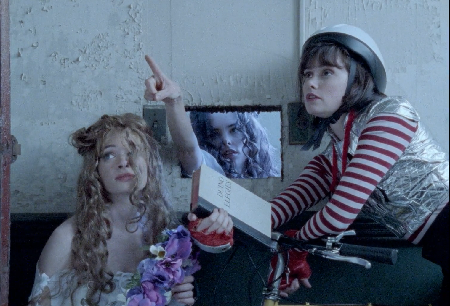 Parker Posey, all’inizio, quasi annoiata dalla sua distanza, gli ha anche rubato un libro, le Duino elegies di Rilke, che usa per l’incantesimo: regala il libro alla ciclista e le indica l’uomo in alto: