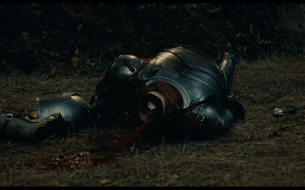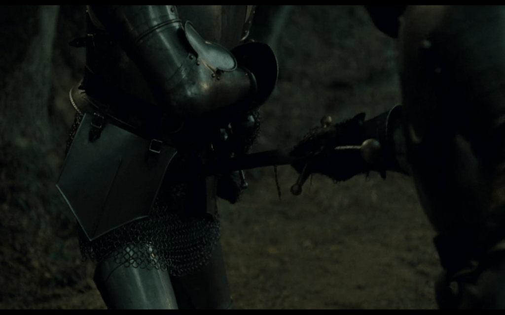 la battaglia per la difesa di Guenièvre non si vede, ma ne apprendiamo l’efferatezza dal fatto che Gauvin, grande paladino di Lancelot, è paradossalmente ferito mortalmente proprio da Lancelot: dai soli dialoghi striminziti si apprende una complicata azione in cui Agravain, fratello di Gauvin, parte dell’esercito di Arthus, affronta Lancelot e rimane ucciso: e per vendicare il fratello, quindi, Gauvin, del campo di Lancelot, cerca di uccidere Lancelot, ma Lancelot uccide pure Gauvin…
