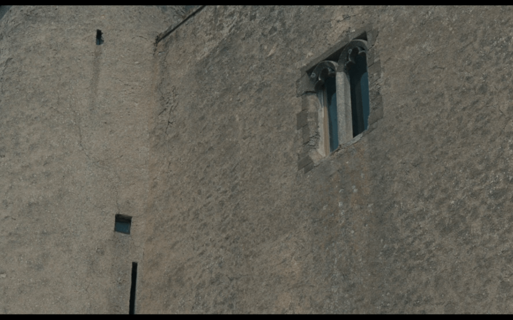 che Mordred sappia tutto dell’Amore tra Guenièvre e Lancelot è detto dal dettaglio della sciarpa di Guenièvre, che Mordred ruba dal posto segreto degli amanti… un posto segreto che viene determinato dal suono dell’allodola, quasi slegato dai dialoghi, che ritorna come un sogno in una trama che non va avanti, ma si poggia appunto su questi simboli per essere percepita… simbolo di Guenièvre anche la bifora della sua finestra, ripresentata come un tema ricorrente…