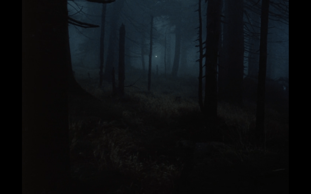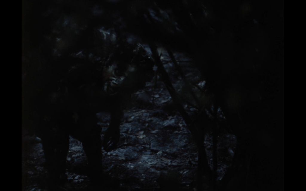 durante l’aggressione, la Bestia sembra fare solo da osservatore, e appare da una breve soggettiva quasi onirica, in mezzo alle fronde, di uno degli spaventatissimi trasportatori aggrediti, di cui vediamo l’atto del guardare dettagli fuori dall’inquadratura: un vedere (è coinvolto anche l’occhio di un cavallo) assai angoscioso…