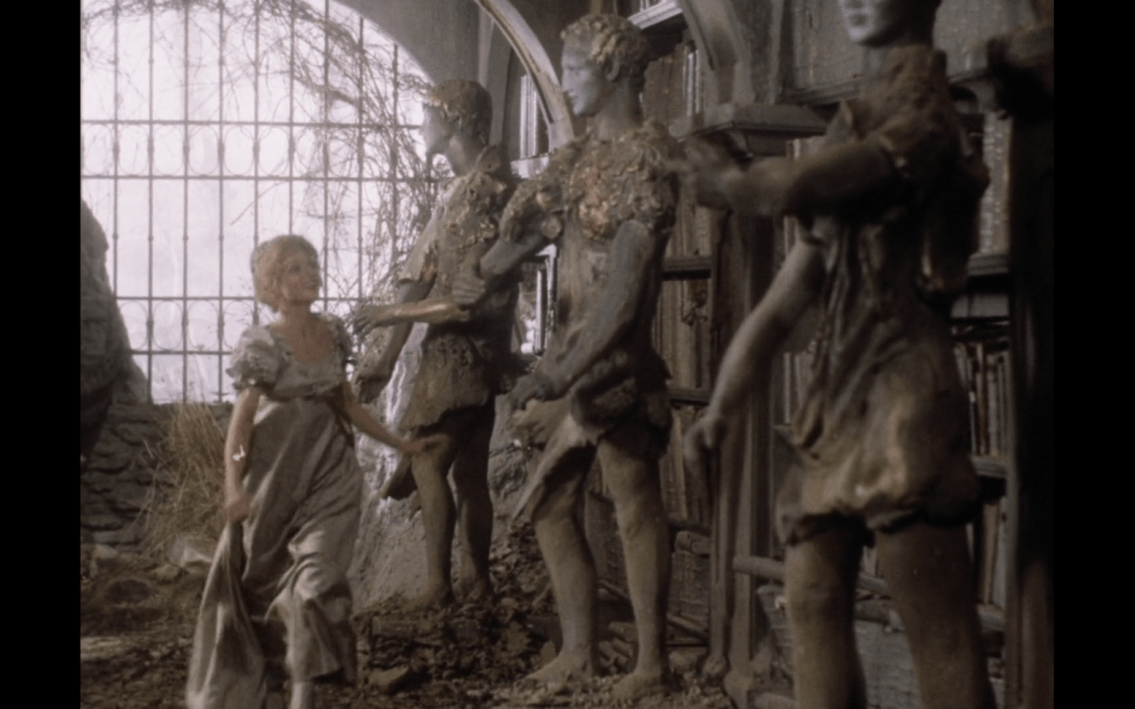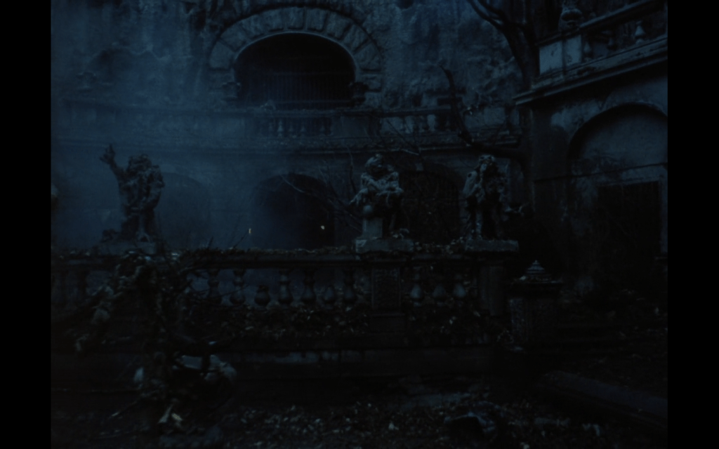 il castello della Bestia è un capolavoro scenografico di inconscio: tremendamente diroccato e sporco, spesso circondato di neve candida e ancestrale, pieno di anfratti segreti, di porte inaccessibili, di telamoni antropomorfi che spesso hanno anche gli occhi, di decorazioni musive che alludono a un passato rinnegato (tessera che giunge anche a Disney, ma i dipinti sui muri di Herz appaiono da subito dipinti di mostri, come se la Bestia fosse sempre stata così e non un uomo poi tramutato), e con statue di bellissimi adoni che sembrano bronzei… e al centro del giardino c’è un lago sulfureo e mefitico, ribollente di fumi e di tragica melma orribile…