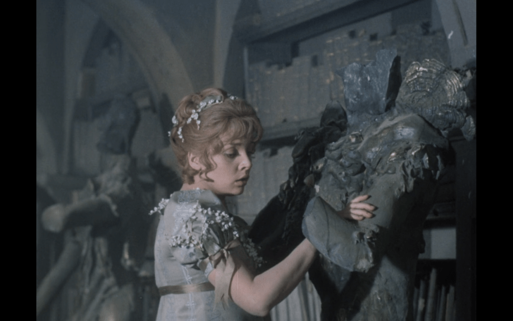 Il film inizia con la tragica fine dei trasportatori del padre di Julie, in una impostazione che inizialmente somiglia molto alla versione di Barbot de Villeneuve (la prima scritta, nel 1740) e alla sua abbreviazione di Leprince de Beaumont (1756), piena di attenzioni all’economia, al commercio, alla borghesia arricchita e all’avidità dei fratelli (qui solo due sorelle) di Julie (l’adattamento di Ota Hofman non dichiara la derivazione dalle trame settecentesche)…